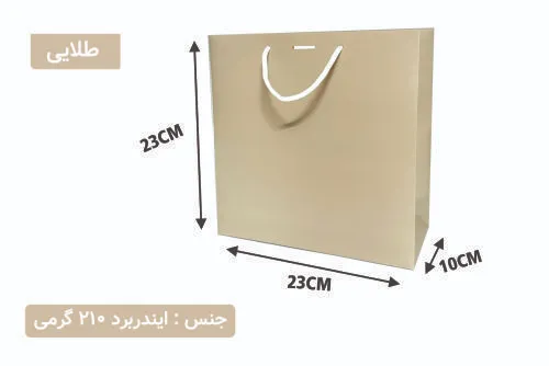 ساک دستی ایندربرد طلایی با ابعاد ۱۰×۲۳×۲۳ سانتیمتر، انتخابی ایدهآل برای بستهبندیهای خاص و لوکس است. این محصول از مقوای ایندربرد ۲۱۰ گرمی ساخته شده که بهدلیل تراکم بالا و سطح صاف، هم استحکام بالایی دارد و هم جلوهای حرفهای به بستهبندی میبخشد.