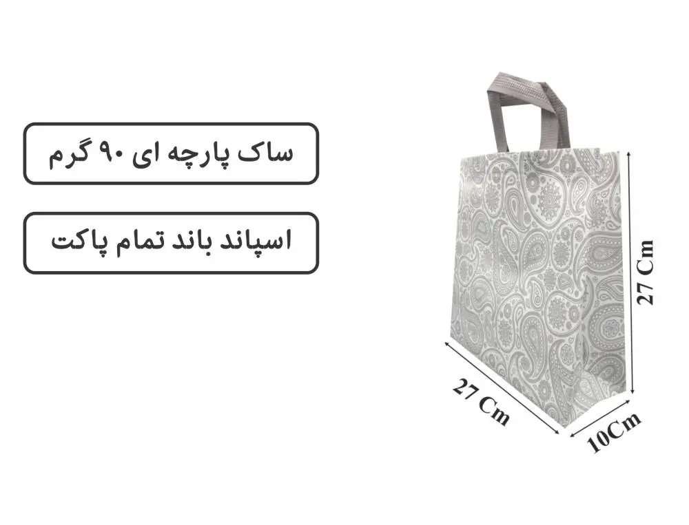 ساک سفید بوته جقه پارچهای 27×27 یک محصول کارآمد و زیباست که برای کسبوکارهای گوناگون امکان تبلیغ حرفهای و تاثیرگذار را فراهم میکند. این ساک دستی آماده از پارچه مرغوب و بادوام با طرح سنتی بوته جقه ساخته شده و توجه مشتریان را جلب میکند. ابعاد استاندارد 27×27 سانتیمتر، فضای کافی برای بستهبندی کالاهای متنوع را فراهم ساخته و حجم و وزن کمی دارد تا هزینه حمل و نقل را کاهش دهد.
