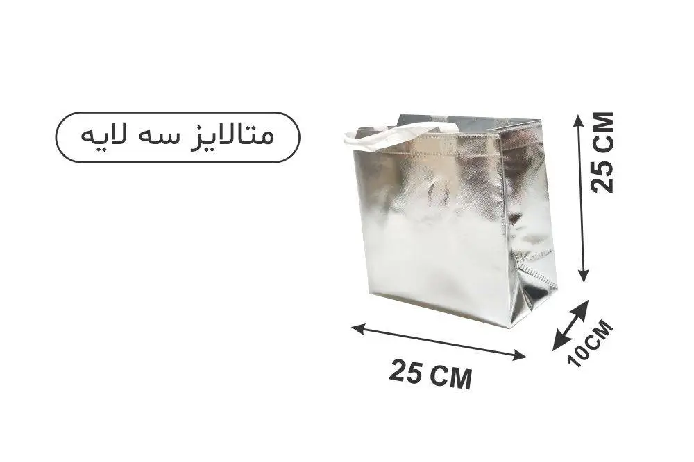 ساک نقره‌ای متالایز ۱۰×۲۵×۲۵ سانتیمتر، یک انتخاب حرفه‌ای و جذاب برای بسته‌بندی و تبلیغ محصولات شماست. این ساک دستی آماده با ابعاد بهینه و طراحی ساده اما چشم‌نواز، به‌خوبی جای محصولات مختلف مثل لوازم آرایشی، پوشاک کوچک، اکسسوری‌ها، نمونه‌کارهای صنایع‌دستی و هدایا را فراهم می‌کند.